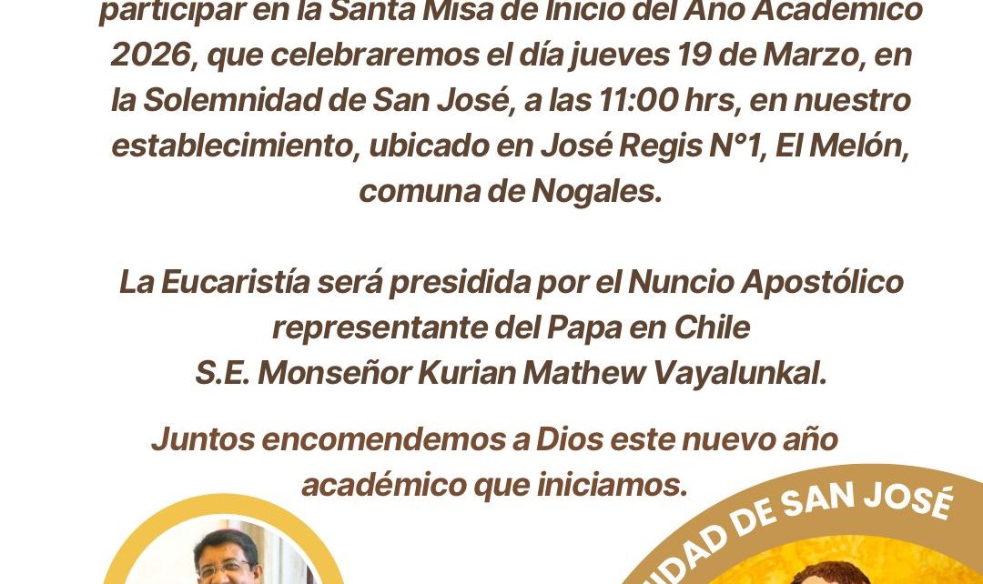 Con mucha alegría como Comunidad Educativo Pastoral Colegio Carmelita Felipe Cortés, los invitamos a acompañarnos en la Santa Misa de Inicio del Año Académico 2026, que celebraremos el jueves 19 de marzo, en la Solemnidad de San José, a las 11:00 horas, en nuestro establecimiento ubicado en José Regis N°1, El Melón, comuna de Nogales. […]