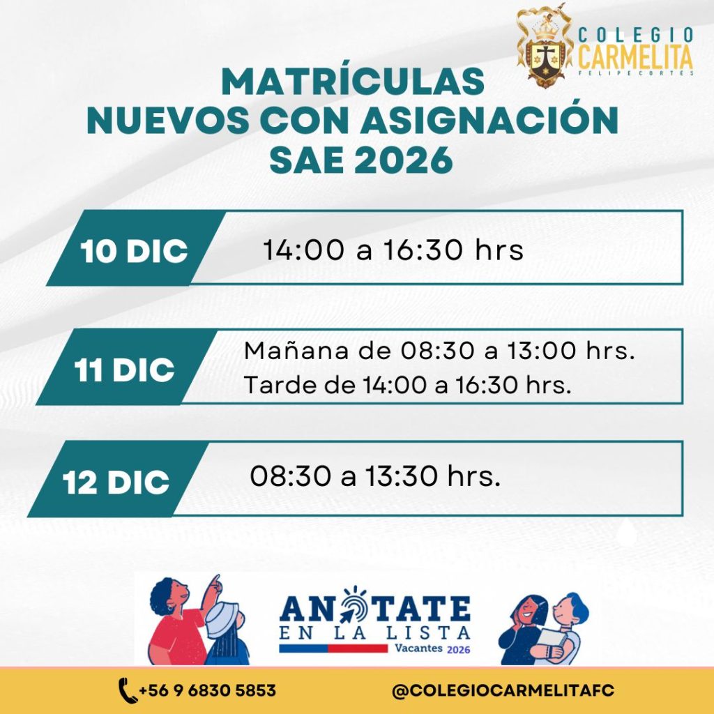 Compartimos con ustedes los días y horarios de matrícula para el PERÍODO DE MATRÍCULAS 2026, con el fin de apoyar una organización clara y oportuna para todos nuestros estudiantes y apoderados.